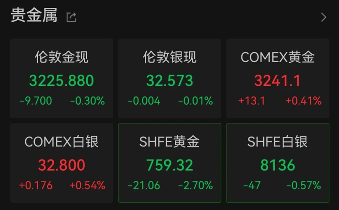 Wind数据显示,12日晚间,国际贵金属期货普遍收跌,COMEX黄金期货跌3.06%报3241.80美元/盎司,现货黄金跌近3%,跌破3250美元关口。13日早间,二者均有小幅波动,截至发稿,现货黄金跌0.3%,报3225.880美元/盎司,COMEX黄金期货涨0.41%,报3241.1美元/盎司。