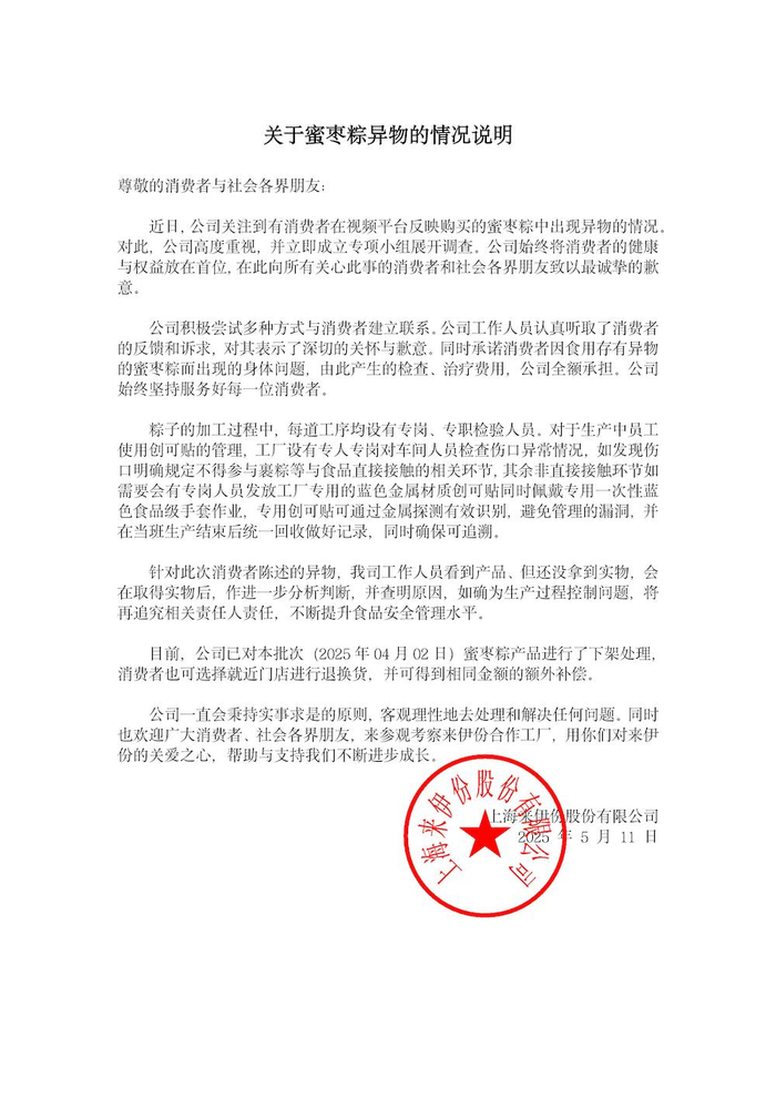来伊份5月12日早间公告,公司已全面下架本批次蜜枣粽产品,消费者可选择就近门店进行退换货,并可得到相同金额的额外补偿。
