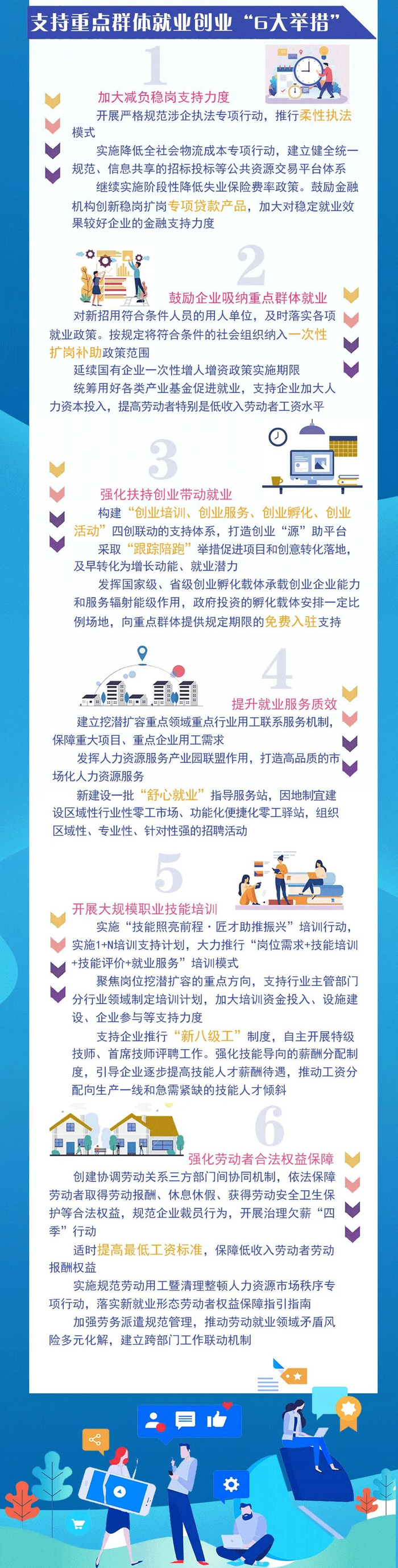 与此同时,我省推出六大举措支持重点群体就业创业。实施降低全社会物流成本专项行动,继续实施阶段性降低失业保险费率政策,对新招用符合条件人员的用人单位,及时落实各项就业政策,按规定将符合条件的社会组织纳入一次性扩岗补助政策范围,延续国有企业一次性增人增资政策实施期限。政府投资的孵化载体安排一定比例场地向重点群体提供规定期限的免费入驻支持。支持企业推行“新八级工”制度,自主开展特级技师、首席技师评聘工作。适时提高最低工资标准,保障低收入劳动者劳动报酬权益。
