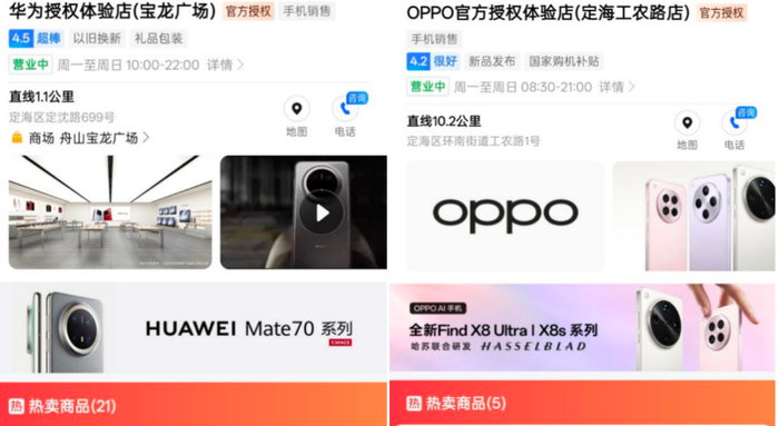 尽管去年OPPO声称新开至少2000家体验店,但相比华为这类玩家,早在过去几年就加码了直营店、授权体验店建设。我们仍以浙江省为例,翻开地图可以清晰对比出一个数据,华为授权体验店(专卖店)可以达到三、四百家,反观OPPO品牌专卖店,在规模上略显不足。