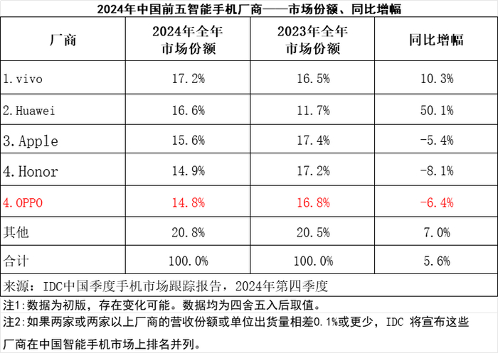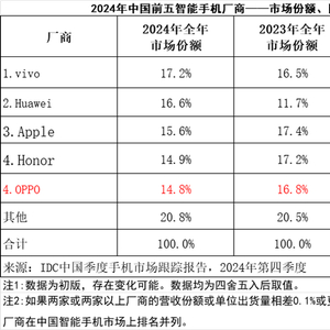 事实上,这还只是OPPO尴尬局面的一个缩影,更大的问题在于:作为主流厂商,OPPO在国内的基本盘有些失守。IDC数据显示,OPPO的市场份额从2023年第一季度的国内第一,已经跌至2025年同期的第三,其中2024年全年则滑落至第四,年增长率为负6.4%,与年增长10.3%的vivo形成鲜明对比。