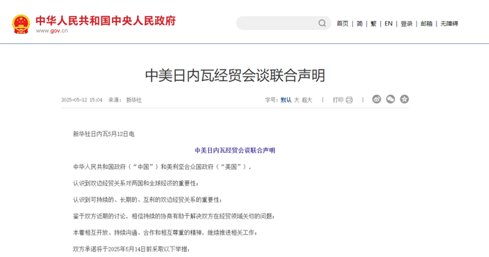 以下是《中美日内瓦经贸会谈联合声明》原文: