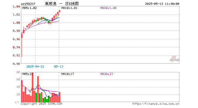 5月13日,截止午间收盘,高股息ETF(159207)涨0.39%,报1.029元,成交额2662.50万元。高股息ETF(159207)重仓股方面,上海银行截止午盘涨3.10%,君正集团跌0.90%,四川路桥涨2.71%,成都银行涨1.40%,渝农商行涨0.84%,南京银行涨0.56%,兴业银行涨0.13%,江苏金租涨0.36%,华夏银行涨1.22%,北京银行涨1.62%。