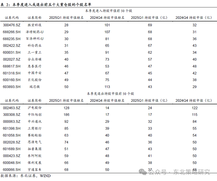 个股方面,权重个股重新洗牌,TOP20中科技占比提升:(1)个股角度来看,TOP5持仓为宁德时代、贵州茅台、美的集团、立讯精密、比亚迪,五粮液掉出前5,比亚迪首次进入TOP5。(2)重仓股行业来看,TOP20中电子7只明显增加,食品饮料4只不变,占据半壁江山;而TOP50中电子为11只遥遥领先,其次为医药7只,食品饮料、电力设备及新能源为5只,行业集中度进一步提高。(3)从进入和退出前50重仓股的名单来看,首先,TOP20基本不变;其次,进入的行业主要集中在电子、医药等板块,而排名上升较多的为泽璟制药-U从107进入29;而排名下降较多的为沪电股份从14下降到128、中际旭创从17下降到186。整体来看,本次排名变动幅度较小,电子的集中度有所提升。