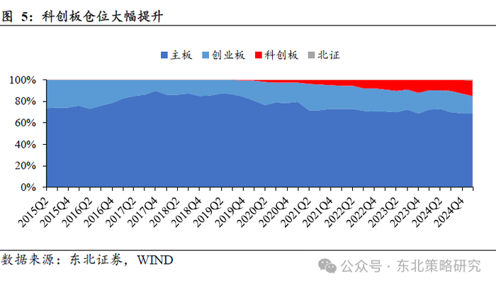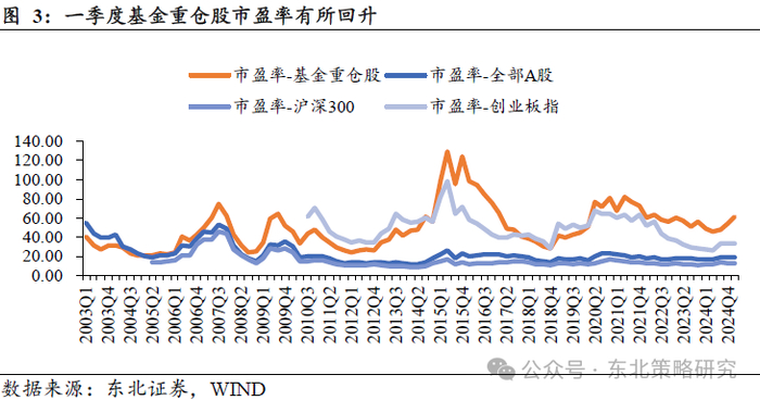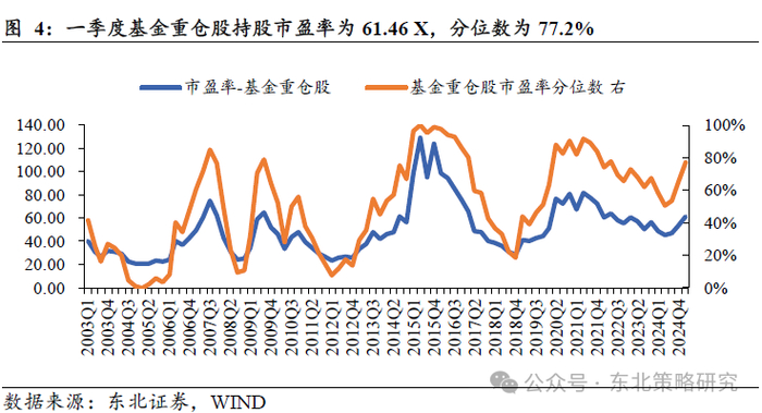 一季度基金重仓股加权市盈率持续提升。2025Q1基金重仓股加权市盈率为61.46X,较上季度的54.02X有所回升;当前市盈率分位数为77.2%,较上季度的65.5%持续提升。本季度基金重仓股的市盈率和沪深300市盈率继续背离,核心原因在于机构继续增配以科技成长为核心的小盘股;另一方面,基金重仓股的加权市盈率仍普遍高于一般宽基指数,且增幅显著高于宽基指数,表明短期机构的重仓股仍存在市盈率过高的风险。