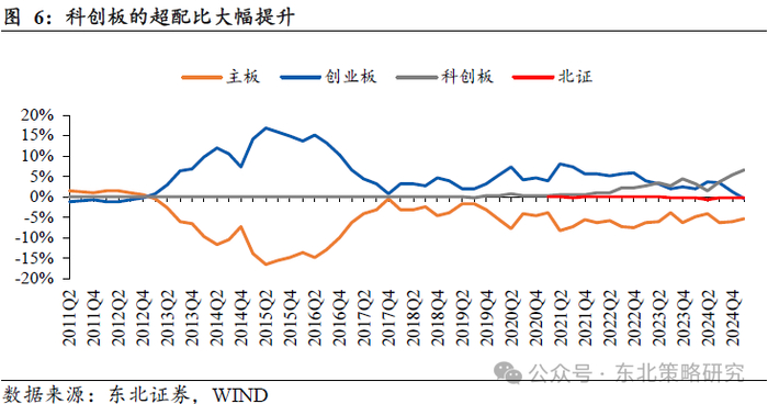 科创板的仓位和超配比明显提升。(1)仓位方面,一季度基金重仓股的主板仓位为68.39%,虽然环比进一步下滑,但是仍为核心仓位;创业板的仓位为16.75%,环比进一步下滑,而且下滑最为明显;科创板的仓位为14.63%,连续三个季度大幅提升;北证的仓位为0.23%小幅提升。(2)超低配方面,一季度基金重仓股的主板超配比为-5.53%,环比上个季度小幅回升,但仍处于较低水平;创业板超配比为-0.65%,2017年来第一次超配比为负,且环比上个季度大幅回落1.85%;科创板超配比为6.60%,环比2024Q4的5.26%进一步大幅提升,超配比分位数达到历史最高值;北证的超配比为-0.42%,为有北证持仓以来的最低位。