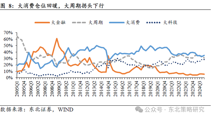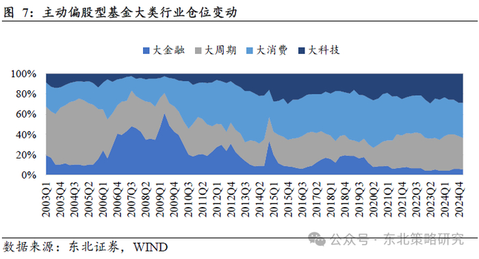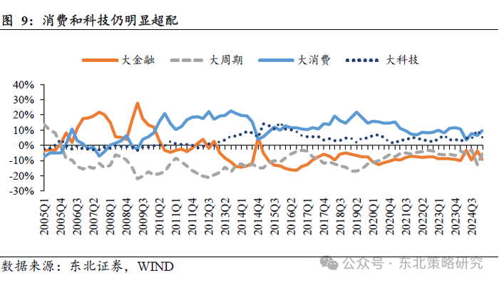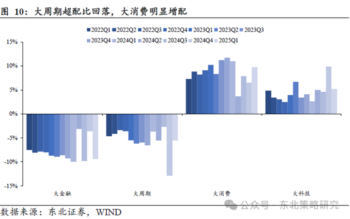 大类行业方面,四季度增持大消费,减持大周期。(1)持仓占比来看,2025Q1主动偏股型基金重仓股的大消费仓位大幅提升,从2024Q4的32.97%上升至34.96%;大周期和大金融的仓位均有不同程度的下降;大科技的整体仓位基本维持不变。(2)超低配比来看,首先,大消费、大科技仍明显超配,但大科技的超配比较2024Q4的5.80%小幅回落至5.17%,大消费超从7.87%大幅提升至9.75%;其次,大金融仍维持低配为-9.41%,环比上个季度基本不变;最后,大周期超配比为-5.51%,环比2024Q4的-3.89%下滑较为明显。整体来看,四季度公募基金增持大消费,减持大周期。