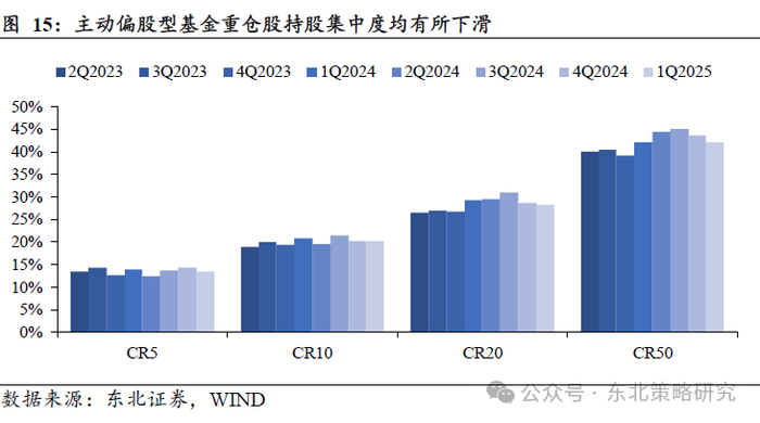 一季度基金持股集中度明显回落。持股集中度方面,2025Q1相比2024Q4来看,CR5从14.35%下降至13.41%,头部的集中度有所回落;但是CR10从20.13%提升至20.19%,集中度却反向提升。CR20从28.73%下降至28.39%,CR50从43.57%下降至42.16%。总体来看,持股集中度均呈现不同程度的回落,表明行业扩散,抱团并不明显。