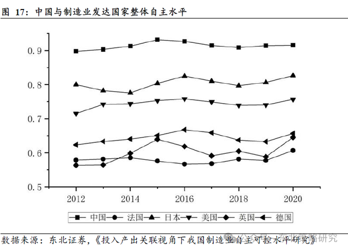 科技自主可控与国产替代方向。关税冲击通过成本倒逼、政策扶持、技术攻坚、资本催化四重机制,加速国内科技自主可控与国产替代进程。我国凭借大国优势,将生产制造中的中间投入尽可能的由国内提供,实现独一档的自主水平。
