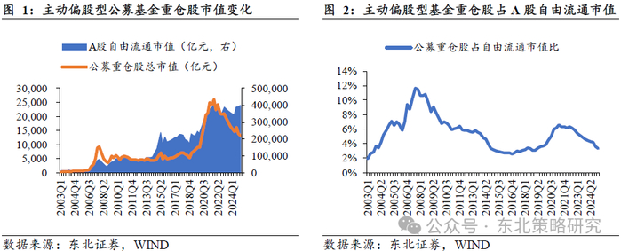 截至目前,成立期满2个月且在运作中的主动偏股型基金(口径为开放式普通股票型981只、开放式偏股混合型4524只、开放式灵活配置型2315只)共7820只基金,已完全披露2025年一季报。截至2025Q1,公募重仓股持股总市值13311.8亿(前值为13933.54亿),在A股自由流通市值的占比为3.34%,较2024Q4的3.55%持续下滑,已经连续下滑了11个季度;一方面在于被动投资风格的崛起,主动产品逐步往指数、ETF等产品转向,另一方面年初以来小盘风格占优且获得明显超额,产品被动赎回较为明显。