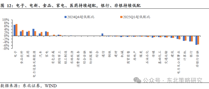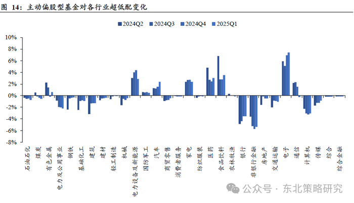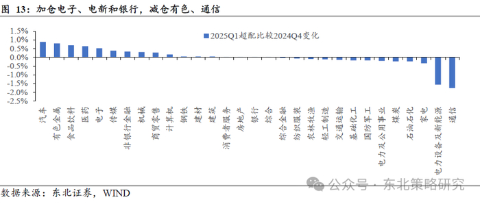 行业方面,一季度加仓科技制造和消费,减仓通信、新能源。(1)从持仓占比来看,2025Q1主动偏股型基金仓位TOP5的行业为电子(19.10%,前值为18.16%)、医药(10.73%,前值为10.05%)、电力设备及新能源(9.80%,前值为11.42%)、食品饮料(8.85%,前值为8.42%)和汽车(6.85%,前值为5.57%),TOP5持仓基本不变,仅医药和电力设备及新能源排名互换;TOP5行业持仓进一步集中。(2)从超配比来看,2025Q1超配比TOP5的行业分别为电子(7.43%,前值为6.91%)、食品饮料(3.51%,前值为2.82%)、医药(3.06%,前值为2.44%)、电力设备及新能源(2.86%,前值为4.41%)和汽车(2.37%,前值为1.49%),TOP5超配比行业集中度提升;食品饮料、医药、汽车和家电等消费板块的超配比提升,而新能源超配比大幅下滑。(3)从超配比变化来看,超配比增加较多的为汽车(0.88%)、有色金属(0.78%)、食品饮料(0.69%)、医药(0.62%),变化幅度并不大;超配比下降最多的为通信(-1.77%)和电力设备及新能源(-1.55%);其他行业变化不大。