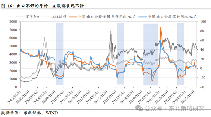 历史经验出口不好的年份,A股都表现比较好。(1)从历史经验上看,出口增速大幅往下走的年份,如2009、2016、2019、2023年,A股都表现比较好。其背后逻辑在于,出口下行往往是受全球经济周期影响,国内政策难以触及;为应对GDP增速的下行压力,大规模的扩内需政策出台以达到维持一定增速的效果;在政策协同上,往往会施行宽松的货币政策,因此宏观流动性向微观流动性的传导,股市往往存在分子端改善预期,叠加分母端的刺激,股市上行。(2)回顾四轮行情,2009年最大的问题是次贷危机后的经济拖累;2016年最大的问题是商品价格的负螺旋;2019年最大的问题是中美摩擦扰动下的弱基本面;2023年最大的问题是“稳增长”的预期变化。总体来看,流动性宽松是A股表现较好的关键因素之一;此外,政策所需要解决问题的核心决定了政策的强弱,2009年和2019年需要一定的强刺激,而2016年和2023年则需要解决经济的内生问题,因此前者表现明显更强。当前来看,美国加征关税对于中国的出口拖累来说已经板上钉钉,但需要看当前政策是否需要配合强力政策去托底经济,还是优先解决经济的内生问题,决定了未来A股的弹性。