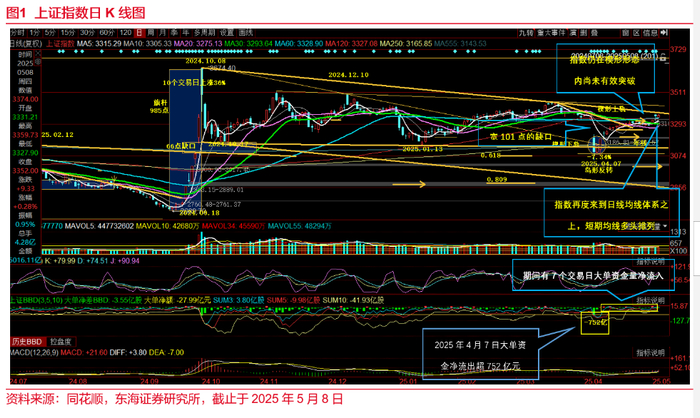 当前走弱的技术条件被快速修复,目前趋势明显改观。上证指数于2025年4月7日大跌后,技术条件没有进一步恶化。随后指数快速收拾局面,开始小碎步震荡盘升,渐次回补了超百点的巨大缺口,消除后市隐患。在2025年4月7日到5月8日,20个交易日中,有7个交易日大单资金明显净流入,累计金额超276亿元,在修复弱势技术条件的过程中,明显有大单资金介入。指数于2025年5月7日,再度上破60日均线与半年线重要点位,再度来到日线均线体系之上,5日、10日、20日均线多头排列,短线均线趋势向上,指数的均线技术条件明显修复。目前指数连续两个交易日处于60日均线之上,60日均线在技术上经常被称为多空分界线,若能有效上破60日均线,指数向上的行情或在震荡中展开。