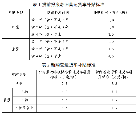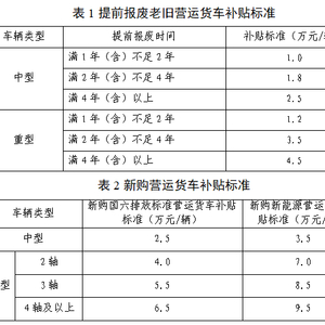 其中,新购国六排放标准营运货车或新能源营运货车补贴标准见表2。报废老旧营运货车提前报废时间不足1年的,可以申请新购营运货车补贴。