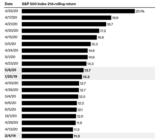 根据彭博社汇编的数据,按21个交易日的滚动行情计算,这是除2020年新冠疫情初期的特殊时期之外,标普500指数在特朗普两任总统任期内录得的最佳涨幅。