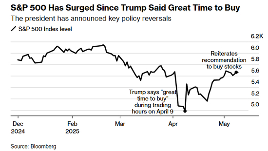 在特朗普宣布“解放日”关税举措后,该美股基准指数曾大幅下跌,但在4月9日他称“现在是买入的好时机”(也就是他暂停实施一些百年来最严厉关税措施的几个小时前)之后的一个月里,该指数上涨了14%。5月8日,他再次重申这一观点,对记者表示经济前景良好,值得大量买入股票。