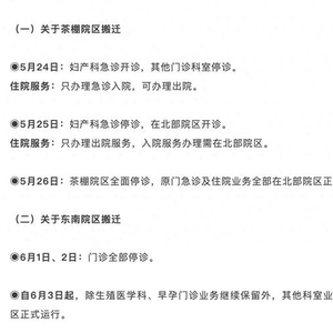 海淀区妇幼保健院将于近期整体搬迁至北部院区。5月26日起,该院茶棚院区全面停诊;6月3日起,东南院区除生殖医学科、早孕门诊保留外,其余科室全部迁至北部院区。