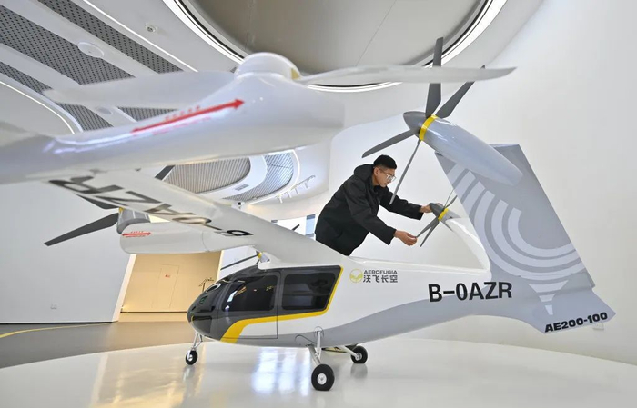 4月9日,在位于成都高新区的低空载人航空器企业沃飞长空公司,工作人员在调整AE200电动垂直起降航空器(eVTOL)批量生产构型的1/4缩比模型。新华社记者 尹栋逊 摄