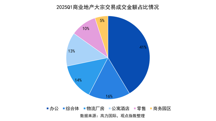 其中,办公物业依然是最受青睐的交易资产类别,交易金额占比达到41%,综合体及零售则分别占比16%和10%,热度同样不低。