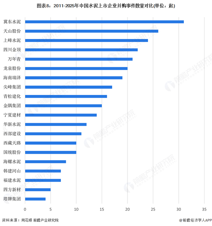 从上市企业上看,2011年至2025年3月15日,同花顺收录的299起水泥行业兼并重组交易中,冀东水泥参与数量最多,达31起;其次是天山股份、上峰水泥,分别为26和24起,四川金顶、万年青和龙泉股份煎饼交易数量也在20起以上,反映这些上市企业业务布局不断扩张。