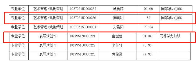 上海戏剧学院官方发布的名单显示,“金世佳”报考的是表导演创作专业学位,业务一科目成绩为94.34分,黄晓明报考的是艺术管理/戏剧策划的专业学位,业务一科目成绩为89分。
