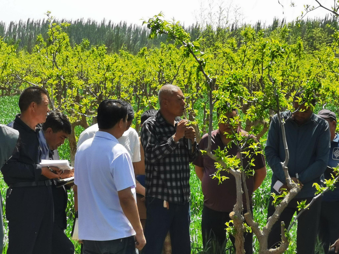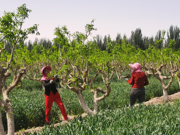 眼下正是枣树摘心抹芽的关键期,泽普县各乡镇积极引导枣农加强枣树管理,为今年全县8.8万亩红枣丰产丰收打下坚实基础。5月6日,在奎依巴格乡墩艾日克村的红枣地,枣农正进行枣树管护。近年来,随着泽普县积极引导枣农从以往的重产量向优品质转变,当地红枣品质得到显著提升。