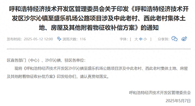 沙尔沁镇至盛乐机场公路项目涉及中此老村、西此老村集体土地、房屋及其他附着物征收补偿方案