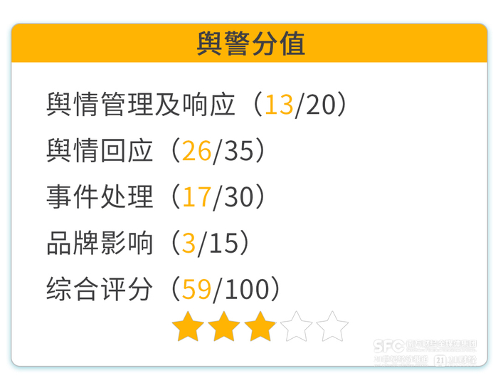 舆警分值:舆情管理及响应(13/20)舆情回应(26/35)事件处理(17/30)品牌影响(3/15)综合评分(59/100)
