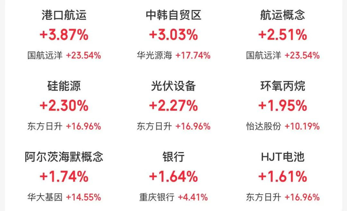 盘面上,港口航运、中韩自贸区、航运概念、硅能源、光伏设备、环氧丙烷、阿尔兹海默概念、银行、HJT电池等板块涨幅靠前;