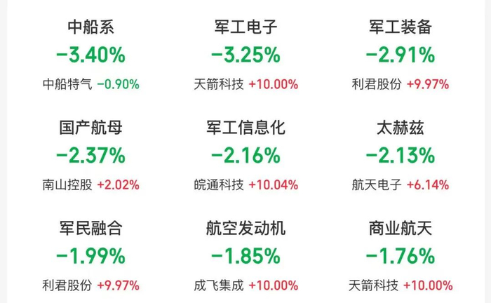 中船系、军工电子、军工装备、国产航母、军工信息化、太赫兹、军民融合、航空发动机、商业航天等板块跌幅靠前。