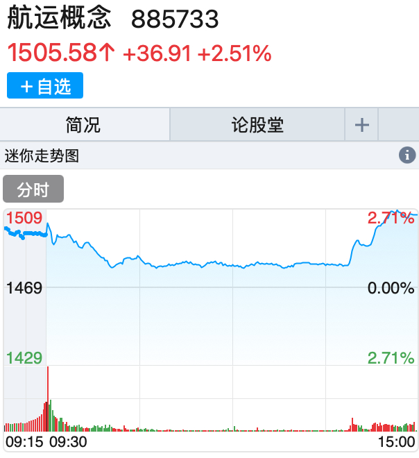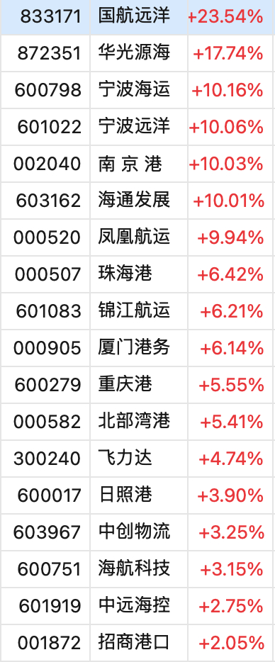 航运概念逆势大涨,国航远洋涨超23%,宁波海运、宁波远洋、南京港、海通发展、凤凰航运涨停,珠海港、锦江航运、厦门港务、重庆港等涨幅居前。消息面上,集运欧线期货主力合约今早大涨超10%,昨日该合约报收涨停。