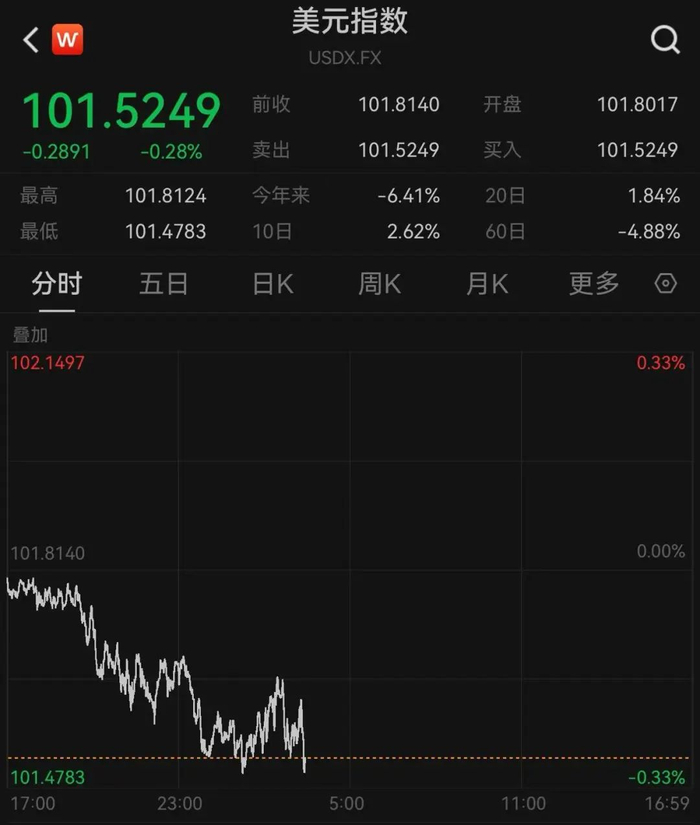 美元指数下跌。美元兑日元日内下跌0.41%,现报147.86。