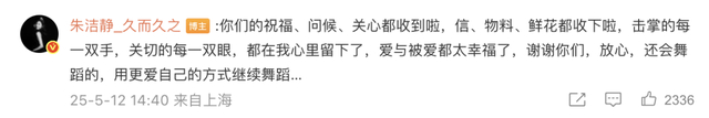 在该条动态的评论区,朱洁静表示大家的祝福、问候、关心都收到了,并称“还会舞蹈的,用更爱自己的方式继续舞蹈。”