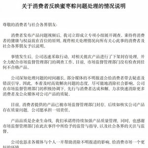 说明称,事情发生后,公司对相关批次产品进行了下架封存处理,并全力配合市场监督管理部门的调查工作。目前,市场监督管理部门没有检查到任何不合格产品。