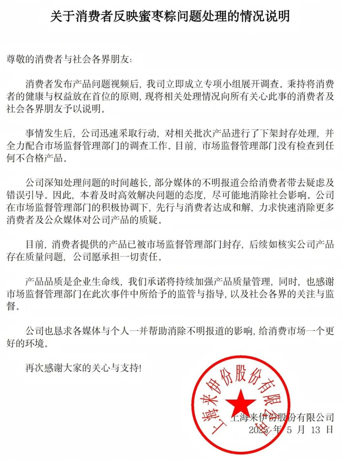 5月13日上午,来伊份在官网发布“关于消费者反映蜜枣粽问题处理的情况说明”。