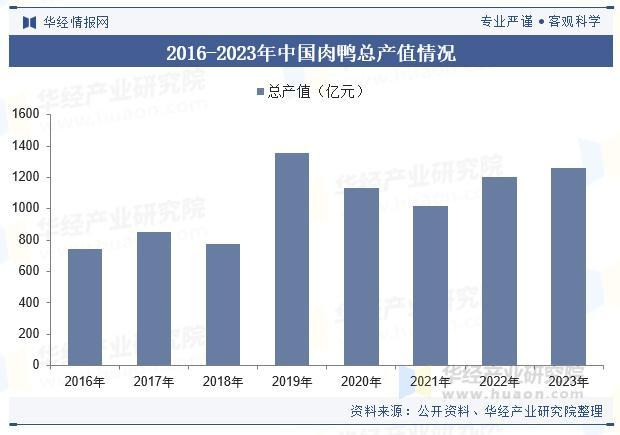 近年来,我国肉鸭产值由2016年的744.80亿元增长至2019年的1357.24亿元。2020年-2021年,受全球经济发展的不确定性以及猪肉供应持续恢复的影响,包括肉鸭在内的其他肉类价格及需求虽较2019年有所下降,2021年产值下降为1017.40亿元,但仍较2018年上升约30.87%。2022年产值1203.07亿元,较2021年上升18.25%。2023年产值1263.69亿元,较2022年上升5.04%。