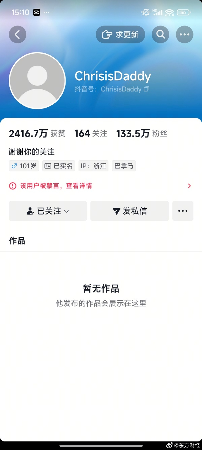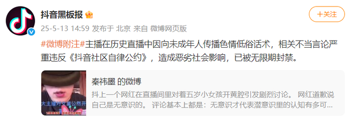 5月13日,据“抖音黑板报”通报:主播在历史直播中因向未成年人传播色情低俗话术,相关不当言论严重违反《抖音社区自律公约》,造成恶劣社会影响,已被无限期封禁。