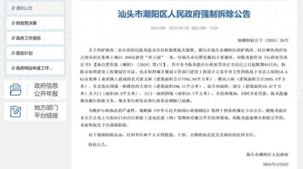 广东汕头市潮阳区人民政府5月9日发布强制拆除公告: