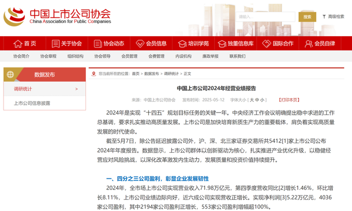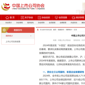 记者据中国上市公司协会(简称“中上协”)获悉,近日,中国上市公司2024年经营业绩报告发布。