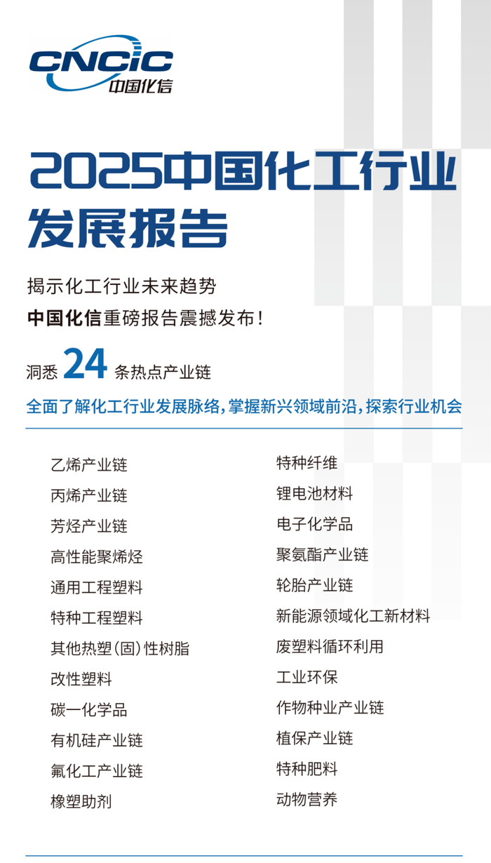 为助力行业人士全面了解化工行业市场环境变化趋势,准确把握产业深度变革方向,中国化工信息中心全面、系统分析研判大宗石化产品、化工新材料与精细化学品、绿色环保、农化与动物营养等产业现状及发展趋势、相关政策,汇编形成《2025中国化工行业发展报告》。