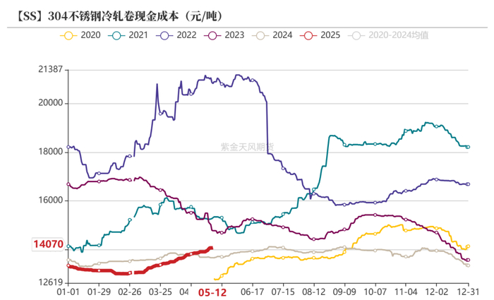 上周原料端低镍铁、高碳铬铁、电解锰价格平稳,废不锈钢价格小幅回升。截至5月12日,中国冷轧304不锈钢平均生产成本环比上周增加171元/吨至14070元/吨,环比增1.23%。