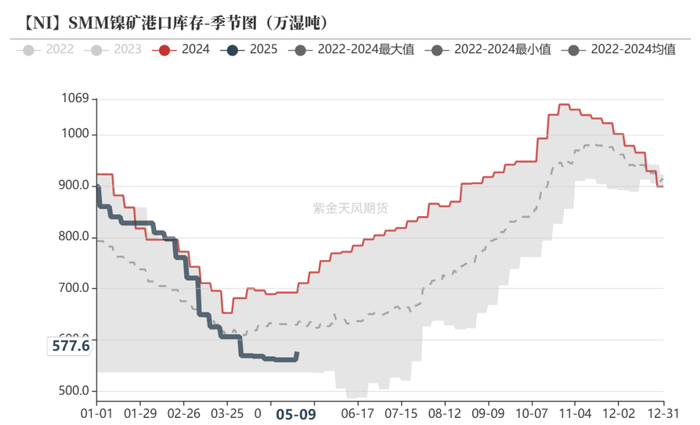 截至5月9日,镍矿港口库存环比上周增加16万吨至577.6万湿吨,环比增2.85%。