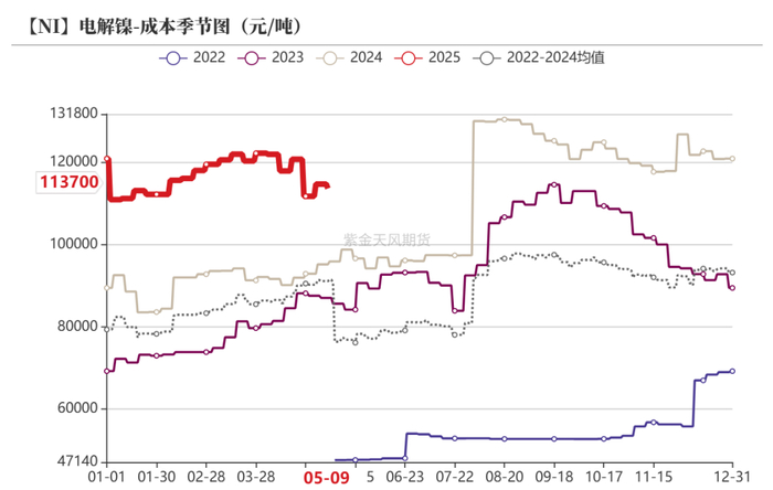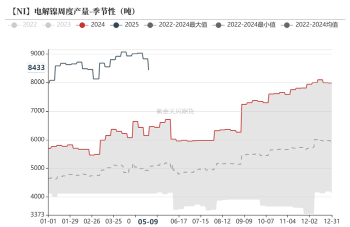 截至2025年5月,全国镍生铁产量(金属量)环比增加0.08万吨至2.63万吨,环比增3.14%。国内部分前期检修冶炼厂恢复生产,但受到成品价格下跌影响,整体产量增幅较为有限。