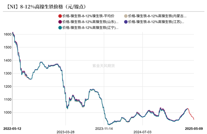国内NPI价格:偏空 至5月9日,8-12%高镍生铁均价环比上周-23.5元/镍点至944元/镍点,环比减2.43%。
