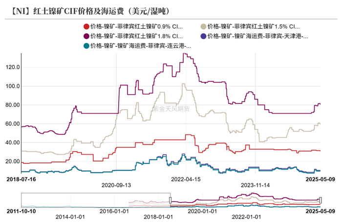 镍矿价格:偏空截至5月9日,菲律宾红土镍矿0.9%、1.5%、1.8%CIF价格环比上周分别-0.5、-1、-1美元/湿吨至31、59.5、80.5美元/湿吨。