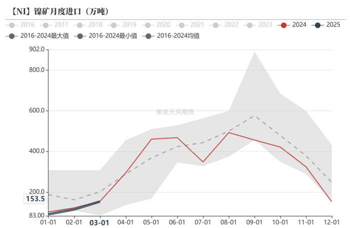 据海关数据统计,2025年3月全国镍矿进口量153.52万吨,环比增33.95%,同比减0.45%。其中红土镍矿进口量151.4万吨,硫化镍矿2.12万吨。自菲律宾进口120.57万吨,占三月进口总量的78.53%。