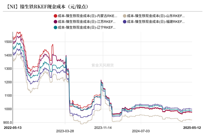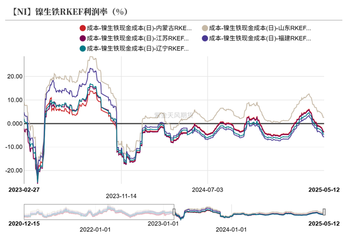 上周菲律宾镍矿价格小幅下行,但整体仍处高位,随着镍铁市场成交价格进一步下跌,国内镍铁厂亏损幅度较大。截至5月12日,山东、内蒙古、江苏、福建RKEF生产现金成本分别为919.05、975.51、978.52、999.23元/镍点,利润率环比分别-2.47、-2.33、-2.33、-2.19个百分点至2.55%、-3.38%、-3.68%、-5.68%。