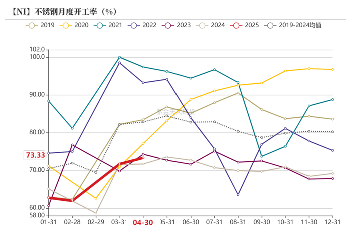截至2025年4月,全国不锈钢开工率环比上月减少1.43个百分点至73.3%。