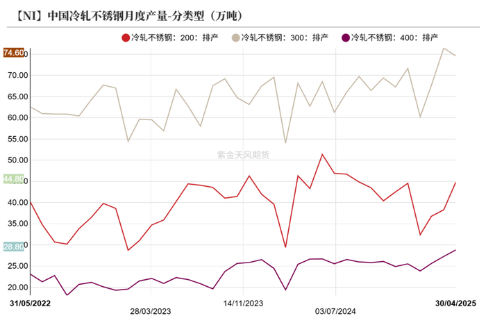 截至2025年5月,全国冷轧不锈钢月度排产环比减少7.76万吨至140.4万吨,环比减5.24%;300系排产环比减少5.4万吨至69.2万吨,环比减7.24%。