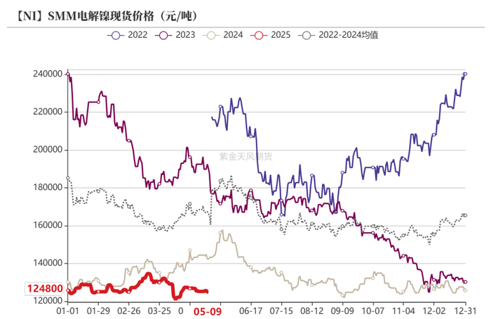 截至5月9日,电解镍现货价格环比上周-350元/吨至124825元/吨,环比减0.28%。